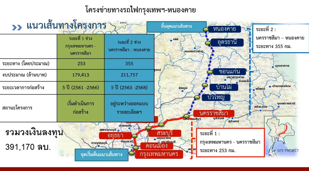 นายศักดิ์สยาม ระบุว่า โครงการรถไฟความเร็วสูงไทย-จีน เส้นกรุงเทพ-หนองคาย เป็นส่วนหนึ่งของโครงการ Belt and Road Initiative แบ่งการดำเนินการเป็น 2 ระยะ ได้แก่ ระยะที่ 1 กรุงเทพ-นครราชสีมา 253 กม. วงเงินก่อสร้าง 1.79 แสนล้านบาท ระยะเวลาก่อสร้าง 5 ปี หรือเริ่มก่อสร้างปี 2561 และเปิดให้บริการเฟสแรกปี 2566 ส่วนระยะที่ 2 นครราชสีมา-หนองคาย 355 กม. วงเงินก่อสร้าง 2.11 แสนล้านบาท ระยะเวลาก่อสร้าง 5 ปี เริ่มก่อสร้างปี 2563-68